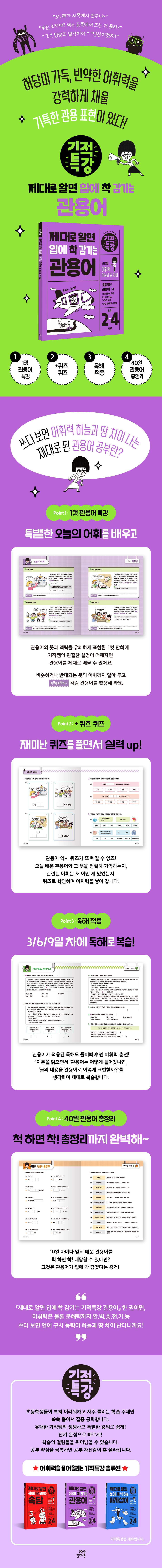 기적특강 『제대로 알면 입에 착 감기는 관용어』는 초등학생이라면 필수로 알아 두어야 할 관용어를 밀도 있게 배워 어휘력을 단기간에 끌어 올리는 교재이다.